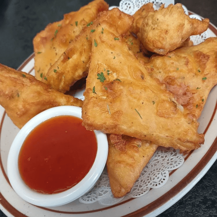 Deep-fried to a golden brown. Sprinkled with parsley. Served with sweet chili sauce.