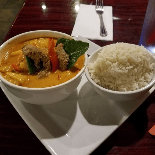 Choice of chicken, pork, tofu, beef or shrimp. Cooked with bamboo shoots, red and green bell peppers, potato, green beans in red or green curry paste with coconut milk and thai basil. Served with a side of jasmine rice