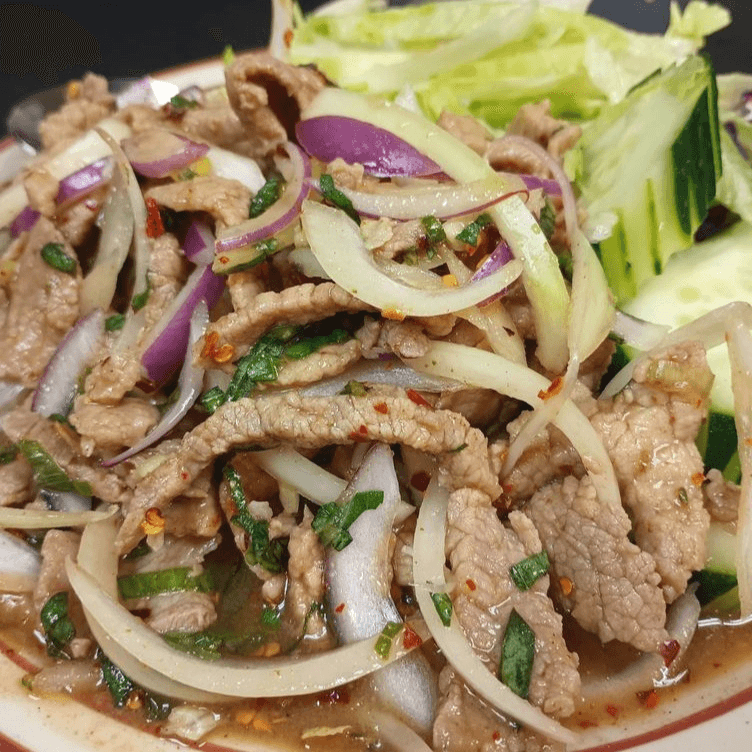 Grilled beef or pork sirloin mixed with fresh lime, yellow & red onions, fresh Thai basil, fish sauce & roasted rice powder. Served over cucumber slices, fresh spinach, red cabbage & lettuce.