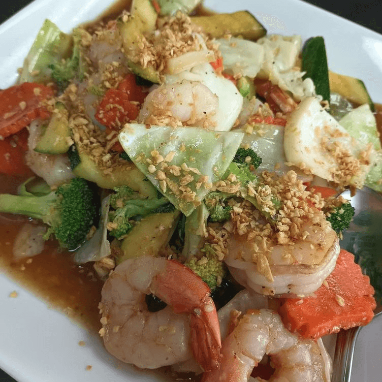Stir fried shrimp. Sautéed with garlic sauce, broccoli, carrots, cabbage and zucchini. Topped with toasted garlic.