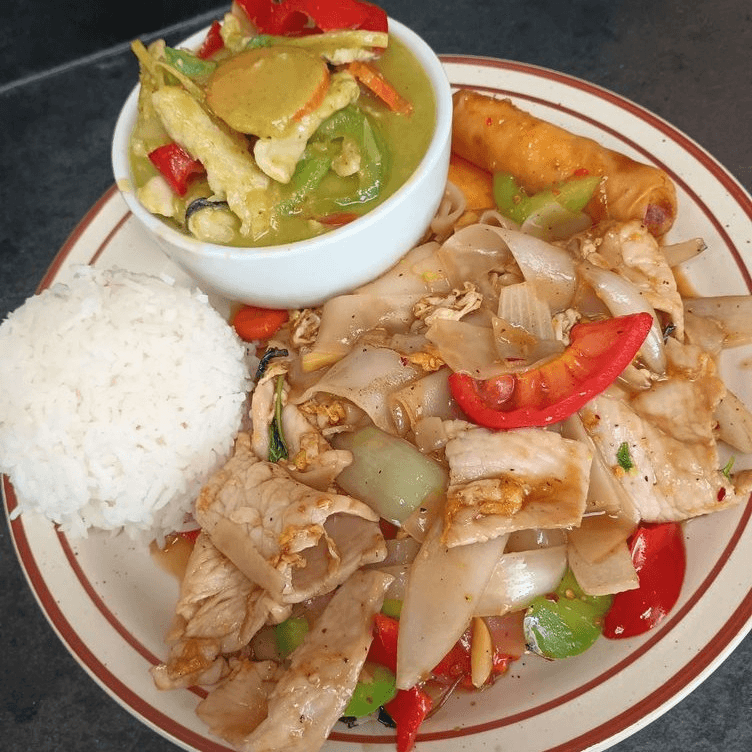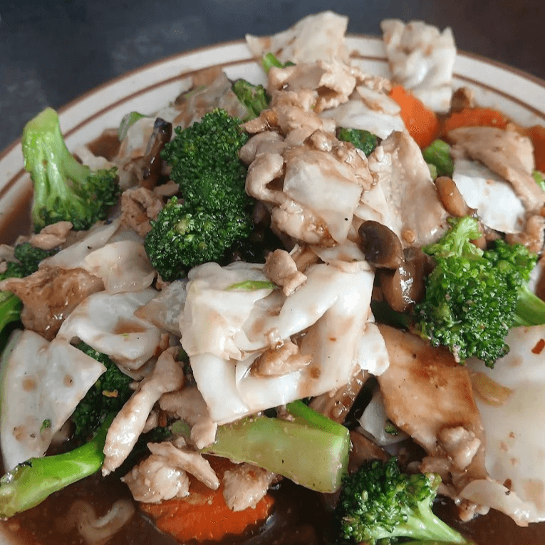 Choice of chicken, pork, tofu, beef or shrimp. Stir fried wide rice noodles with garlic, egg, onion, fresh thai basil, red and green bell peppers, bamboo, oyster sauce, carrots