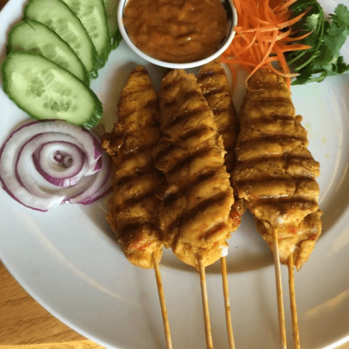 Chicken breast strips marinated in a mixture of Thai spices and coconut milk. Served with peanut sauce.