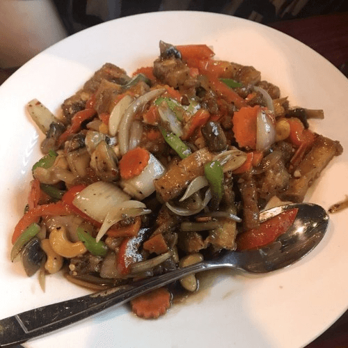 Battered deep fried tofu with carrots, red & green bell pepper, fresh ginger, onion, cashews, garlic and sesame oil in oyster sauce.