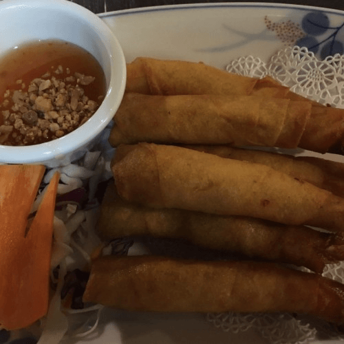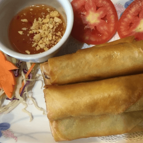 Fried spring roll wrap stuffed with glass noodles, carrots, celery, cabbage, salt, pepper and soy sauce. Served with sweet chili sauce.
