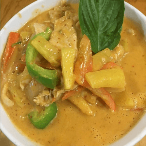 Red curry paste with pineapple, red & green bell peppers, carrots and fresh thai basil in coconut milk.