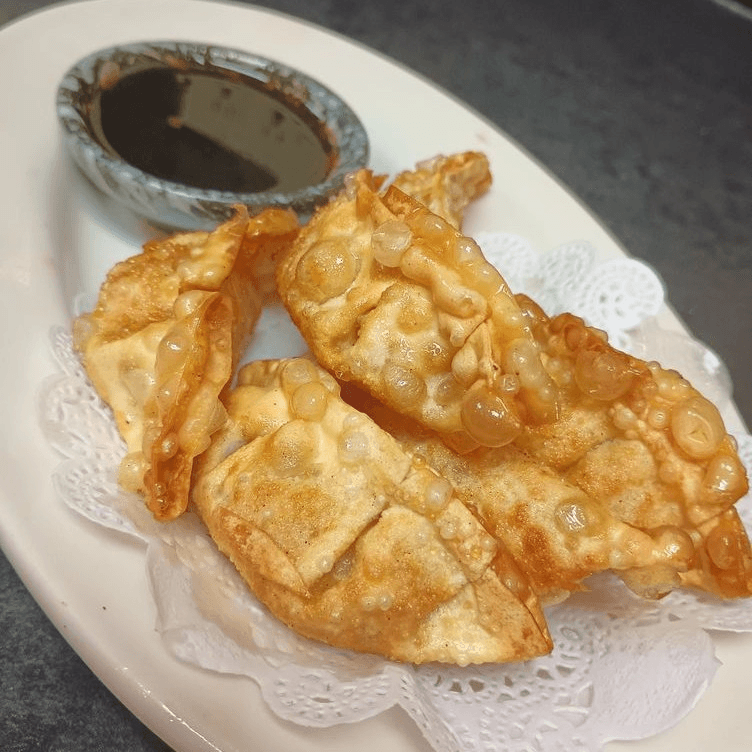 Ground pork & chicken, water chestnuts, soy sauce, garlic powder, sesame oil, and egg wrapped in wonton wrap. Topped with green onions and dried garlic. Served with sweet black soy sauce.