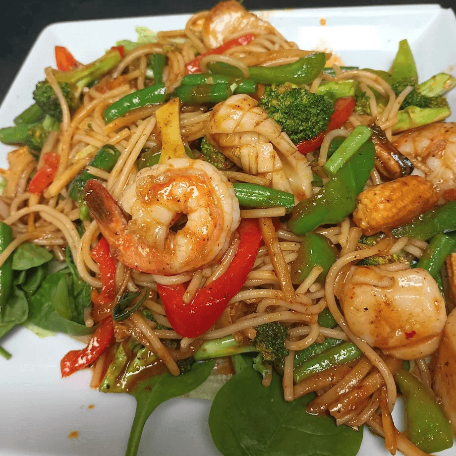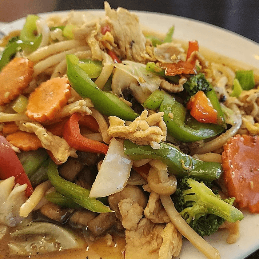 Choice of chicken, pork, tofu, beef or shrimp. Stir fried with egg noodles, broccoli, carrots, egg, garlic, cabbage, celery, red & green bell pepper, onion, oyster sauce, pad Thai sauce and vinegar