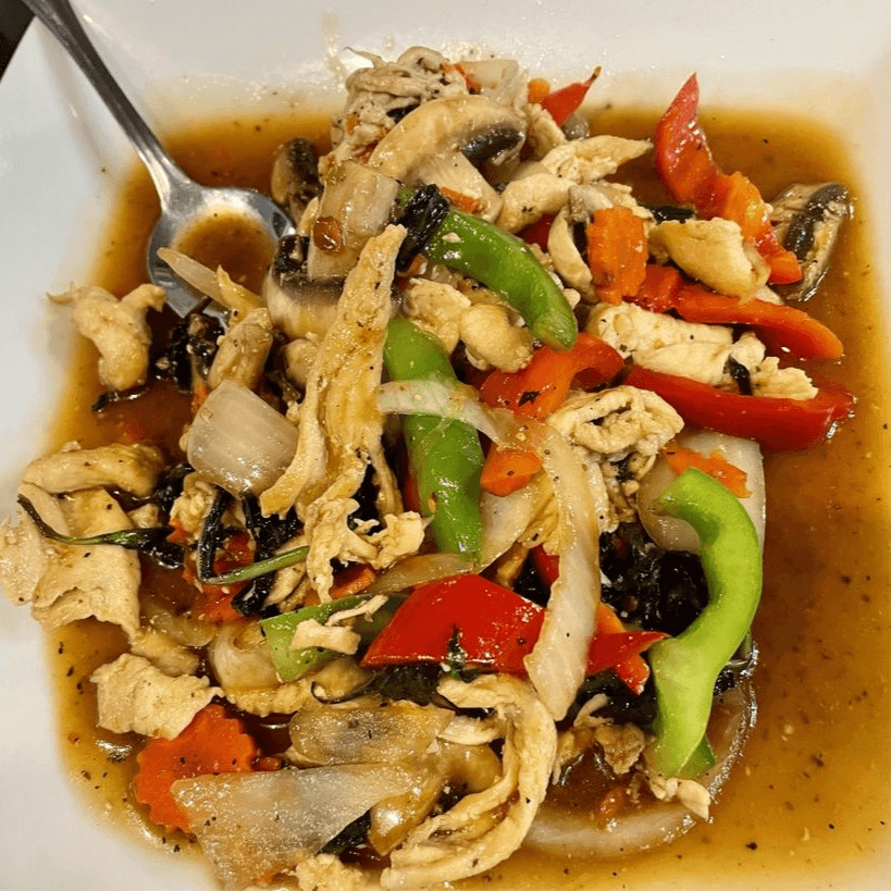 Choice of chicken, pork, tofu, beef or shrimp. Stir fried with onions, mushrooms, carrots, green beans, red and green bell peppers and fresh Thai basil, garlic in oyster sauce. Served with a side of jasmine rice