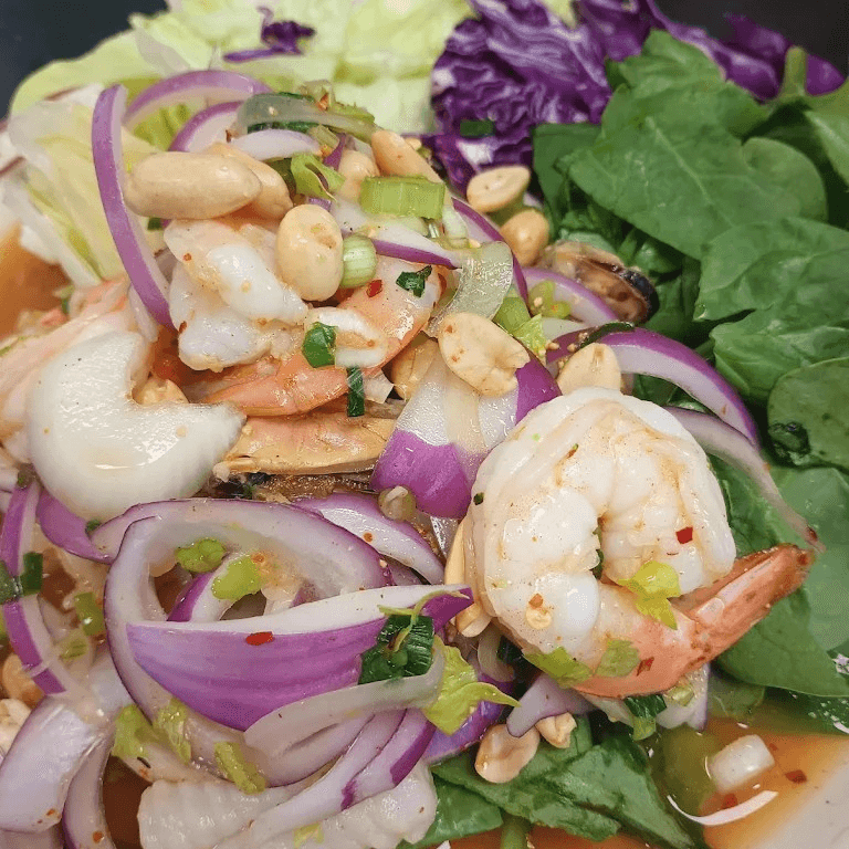 Mixed shrimp, scallops, calamari and mussels with yellow & red onion, celery, tomato, green onion, fresh ginger, fish sauce, chili paste & lime juice in spicy Thai dressing.