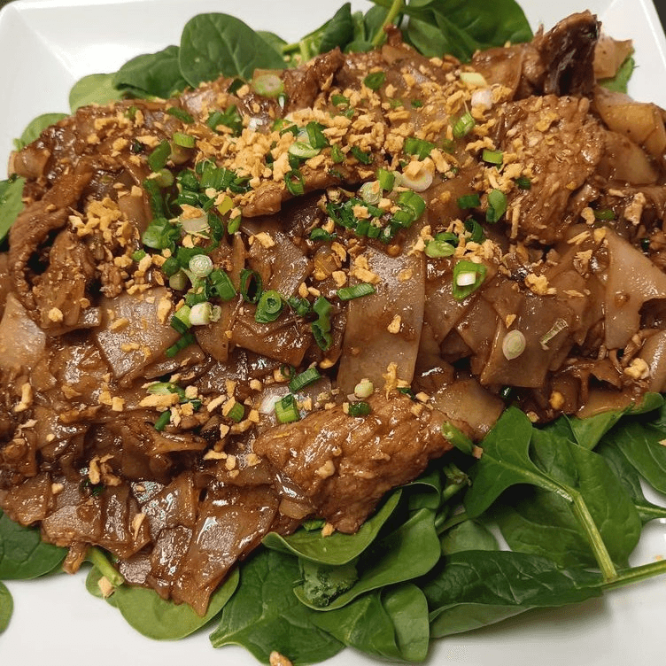 Stir fried wide rice noodles with egg, garlic, green onion, oyster & sweet black soy sauce. Served on fresh spinach and lettuce. Topped with green onion & toasted garlic.