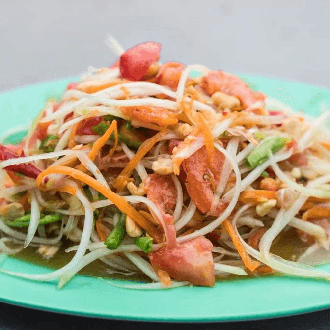 Fresh green papaya mixed with carrot, green bean, tomato, peanuts, fresh chili, garlic, fish sauce, fresh lime in a spicy Thai dressing. Served over fresh spinach, red cabbage & lettuce.