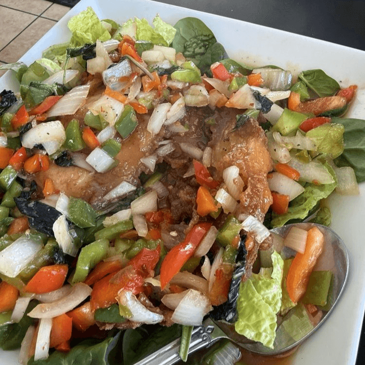 Two deep-fried tilapia fillet, chopped onion, red & green bell pepper, fresh spinach and fresh thai basil in a sweet chili sauce.